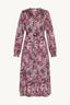 Printed midi dress in 100% viscose with V-neck and long sleeves. Features a button-down front, waist belt with buckle and elasticated cuffs for a feminine silhouette.